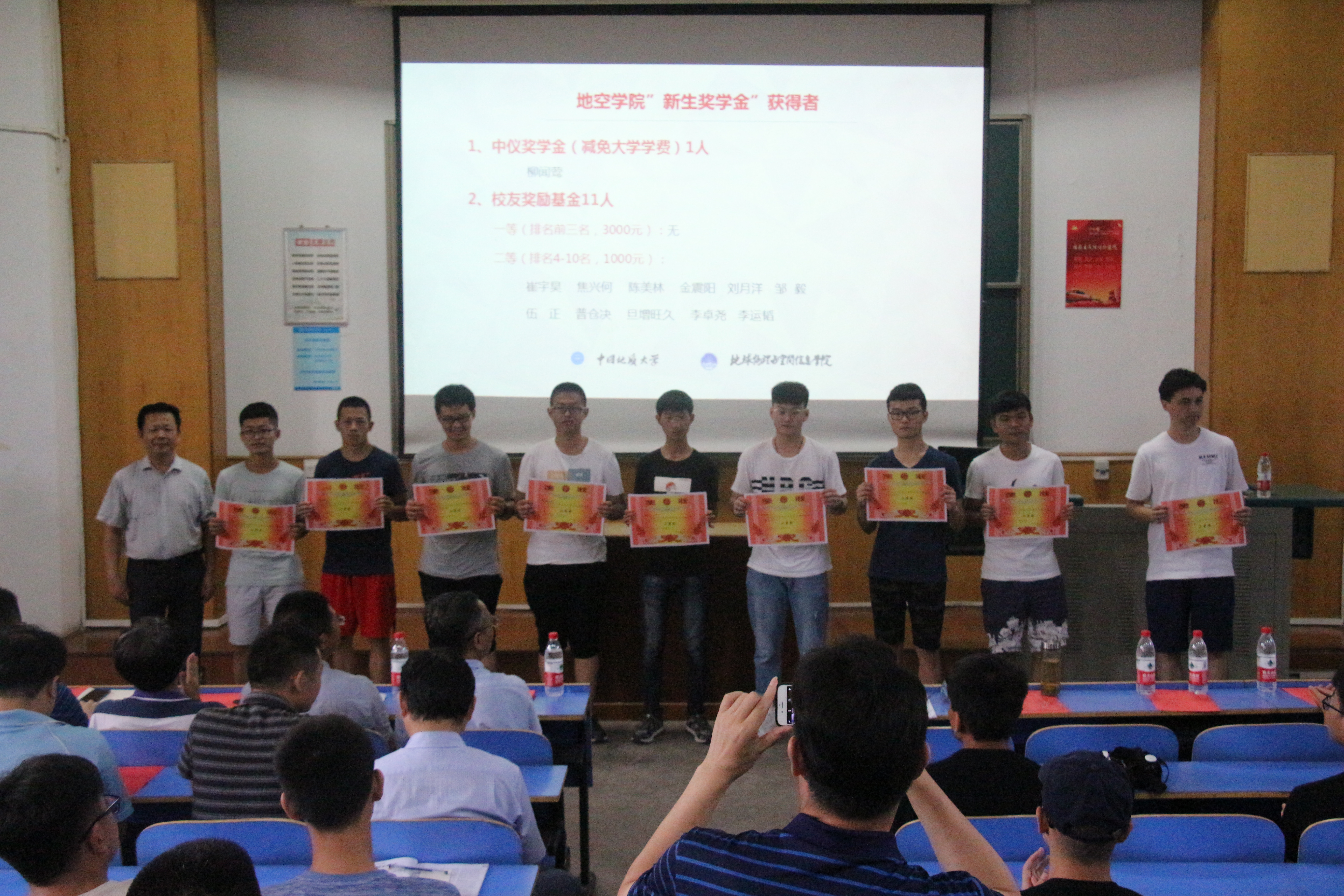会议伊始,学院举行新生表彰。罗银河副院长宣读了学院2018级本科新生奖学金获奖名单,顾汉明副院长宣读优秀推免研究生入选名单,学院院长和书记先后为获奖新生颁奖。李周波副书记对获奖学生表示祝贺,希望获奖新生在大学期间再接再厉,号召全体新生向获奖学生学习。
