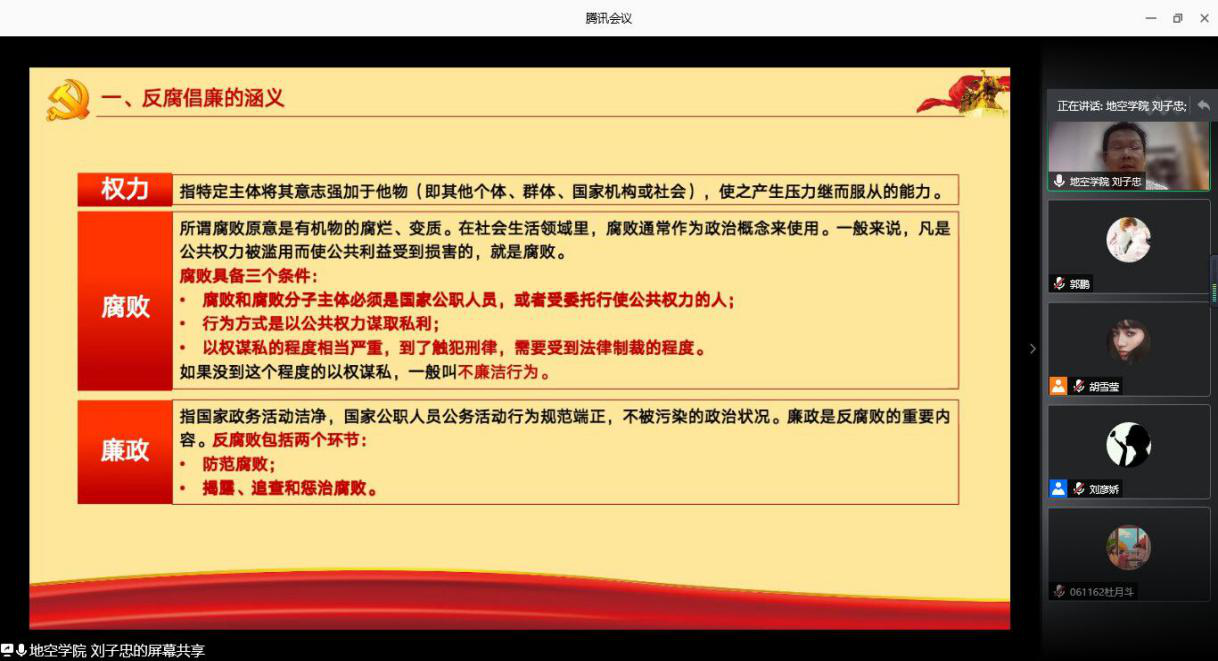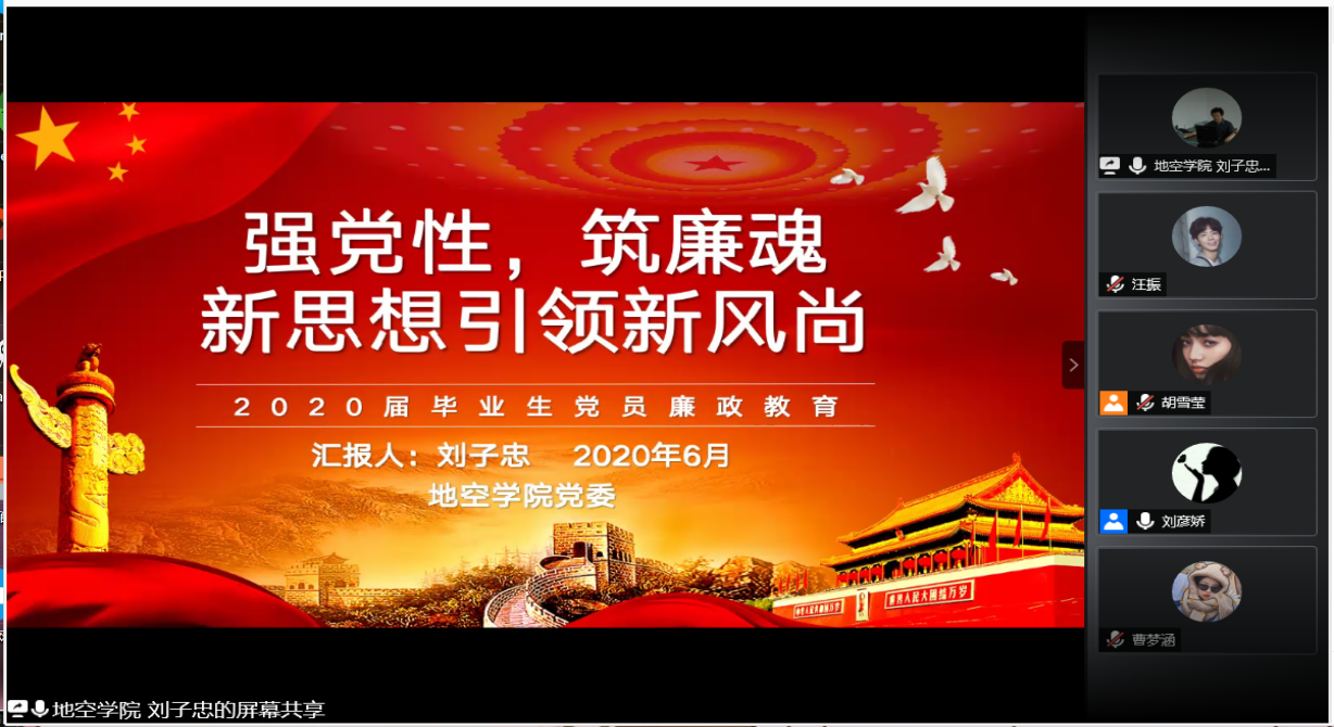 党委于6月24日晚19:30通过腾讯会议平台组织学院全体毕业生党员进行党员廉政教育。课程由学院党委书记刘子忠主讲,辅导员刘彦娇主持。