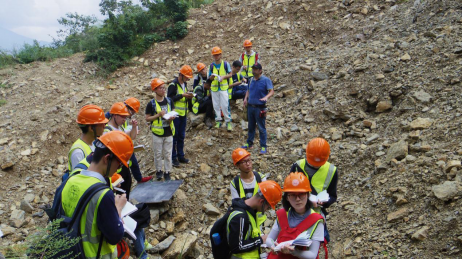 佘振兵在下岸溪石料厂给061161班学生讲解矿物的野外识别方法(9月3日)