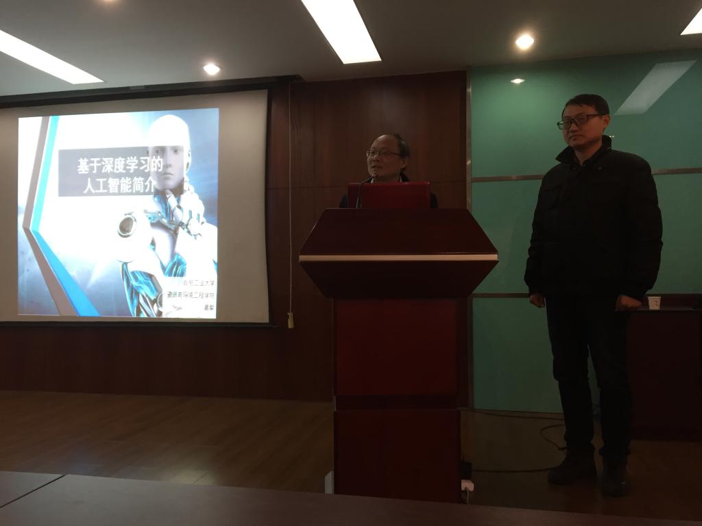 ,并在物探楼222学术报告厅做了题为“基于深度学习的人工智能简介”的学术报告,全校100多位师生参加了报告会,会议由熊熊院长主持。