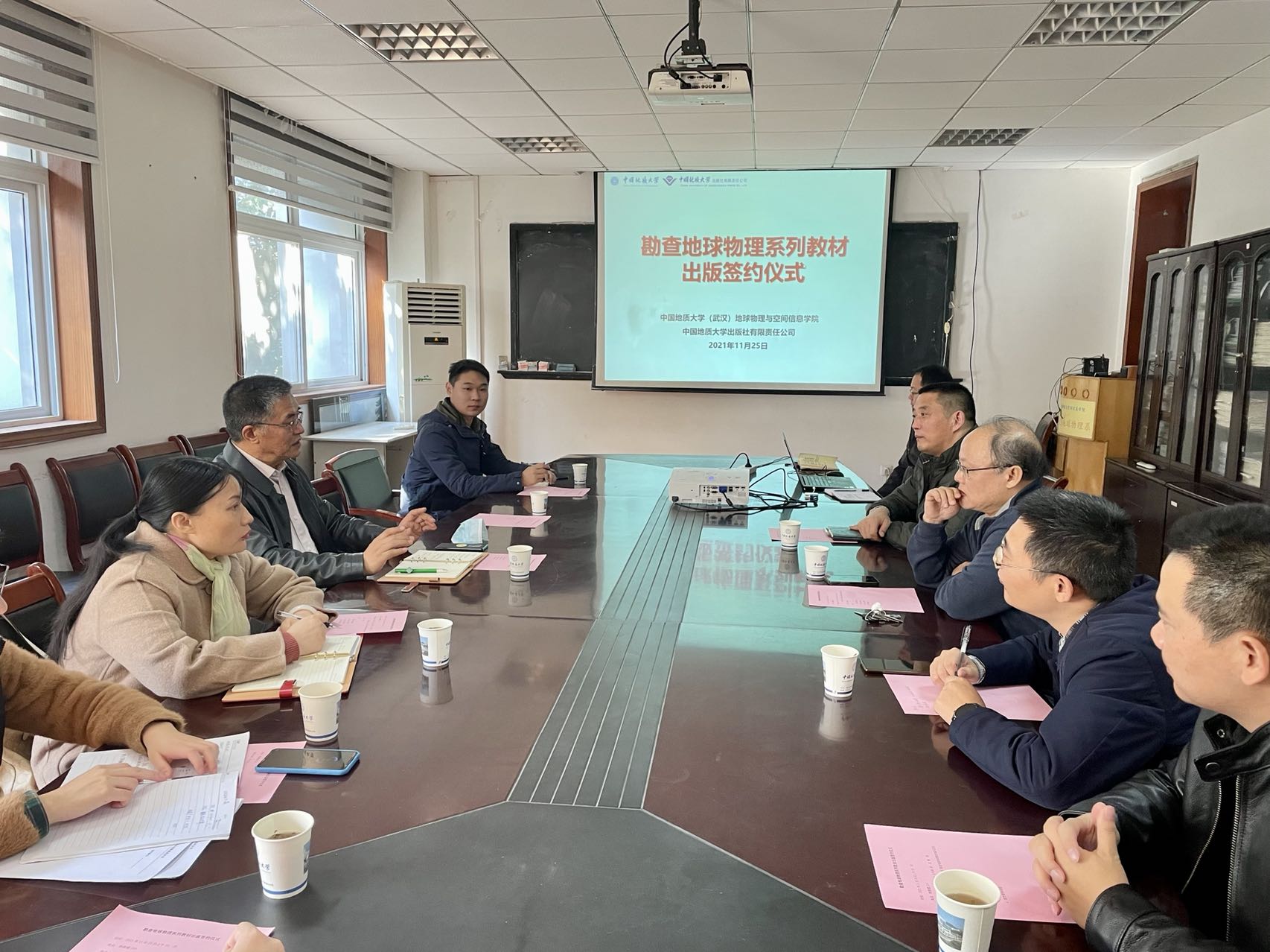 在物探楼214举办勘查地球物理系列教材签约仪式,会议由马彦周书记主持。罗银河副院长介绍勘查地球物理系列教材建设情况。中国地质大学出版社社长毕克成介绍了近年来教材和专著出版情况,并从系列化教材建设与研究成果出版给出建议。熊熊院长介绍了开云体育官网