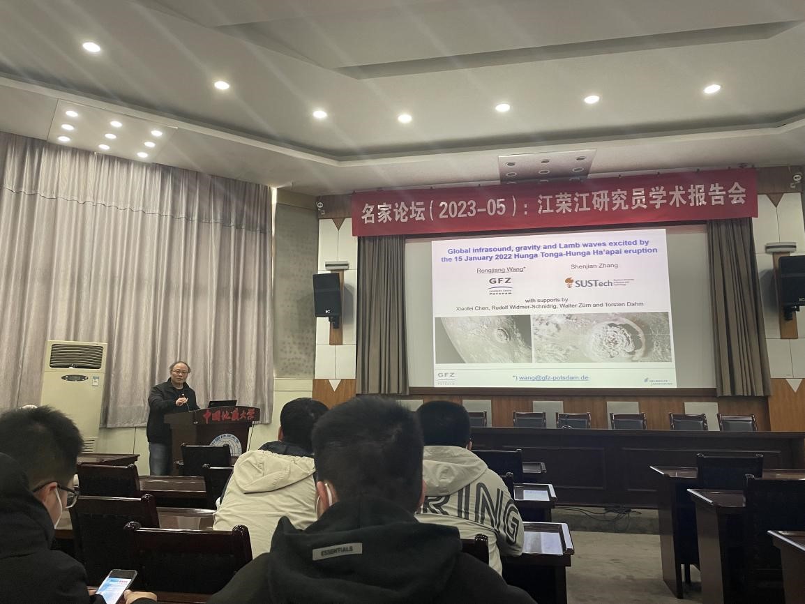 熊熊教授、胡祥云教授邀请,德国地学中心(GFZ)资深研究员国际著名地球物理学家汪荣江教授于2023年3月17日来校访问,在地质大学东区八角楼学术报告厅以“2022年1月15日汤加火山爆发引起的全球大气次声波、重力波和Lamb波”为题做了精彩的学术报告。