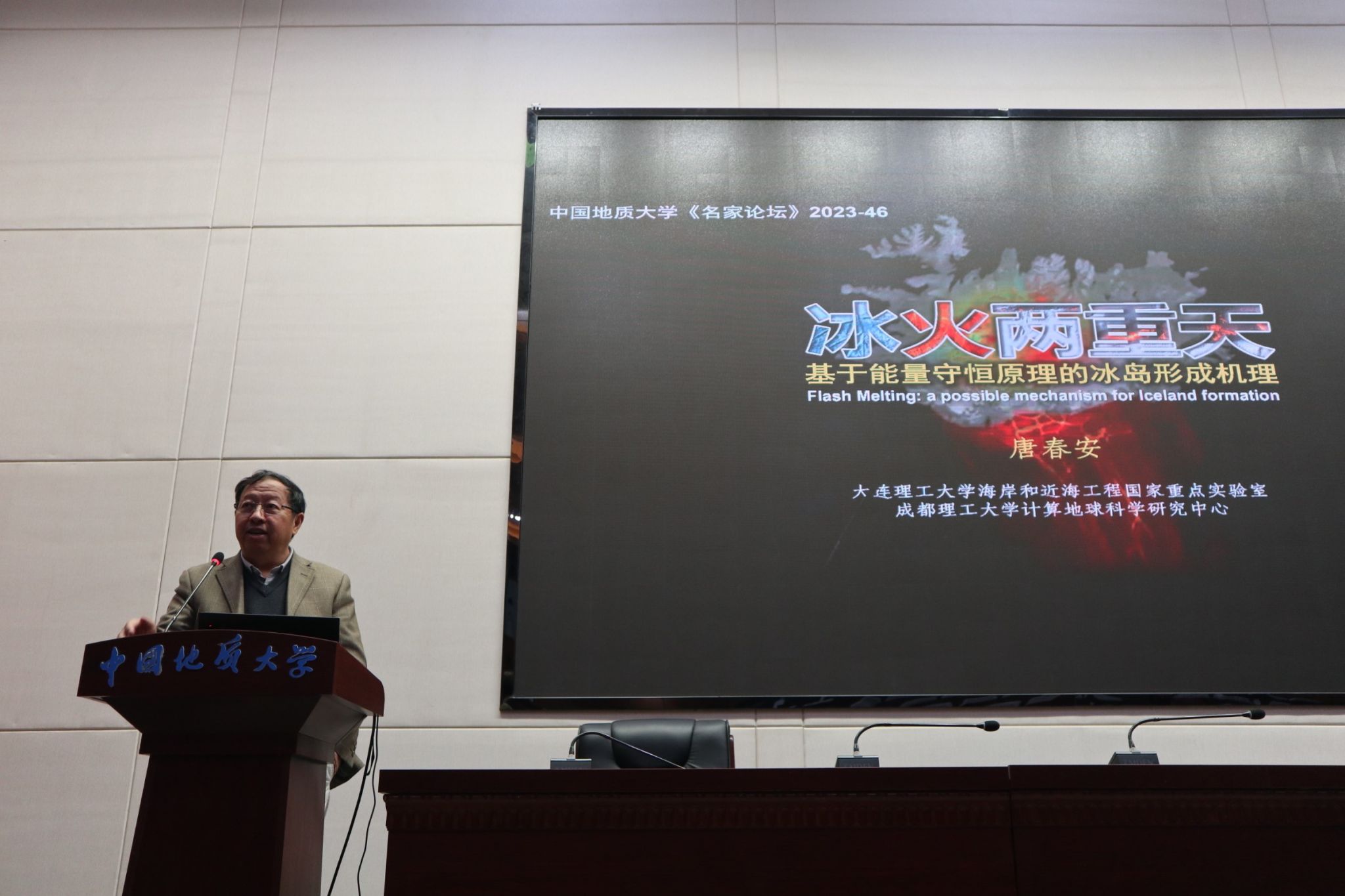 尽管冰岛的冰川形成受气候变化、地质条件、海洋活动等多种因素影响,但冰川与火山并存的冰火两重天特征,一直没有得到很好的解释。报告人唐春安教授基于热力学、物理学和力学的基本原理,从地热积累、膨胀和熔融扩容的热力驱动机制入手,以洋中脊深大破裂诱发巨量降压熔融及其大范围吸热降温的热能平衡原理为基础,提出了冰岛形成机理的新解说。