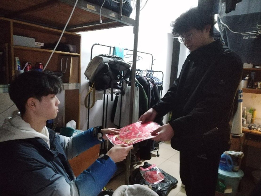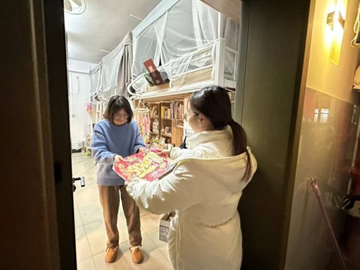 学生组织上门为广大同学们送上了精美的福字和窗花。福字和窗花不仅寓意着福运临门、吉祥如意的美好祝愿,还具有浓厚的民俗文化气息,让同学们感受传统文化的魅力。